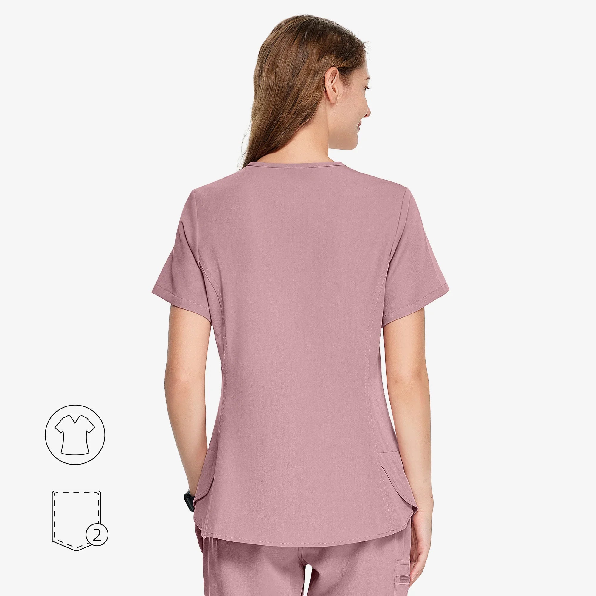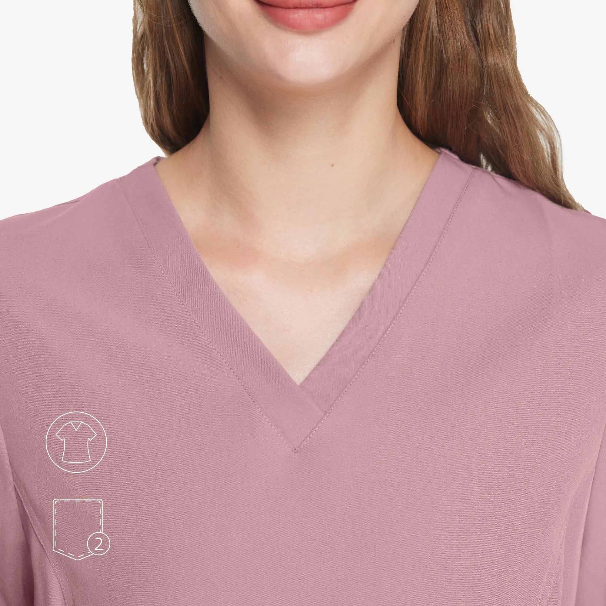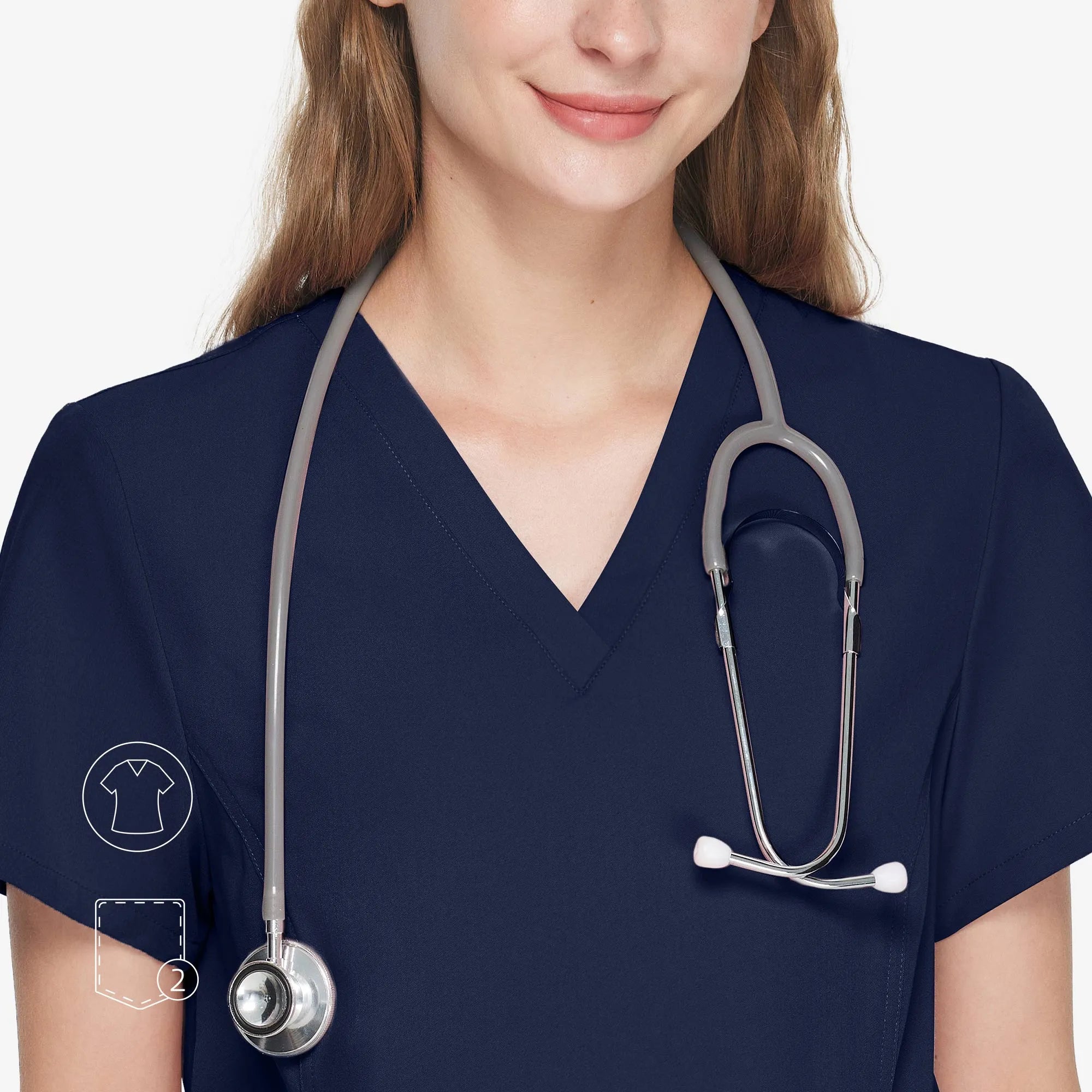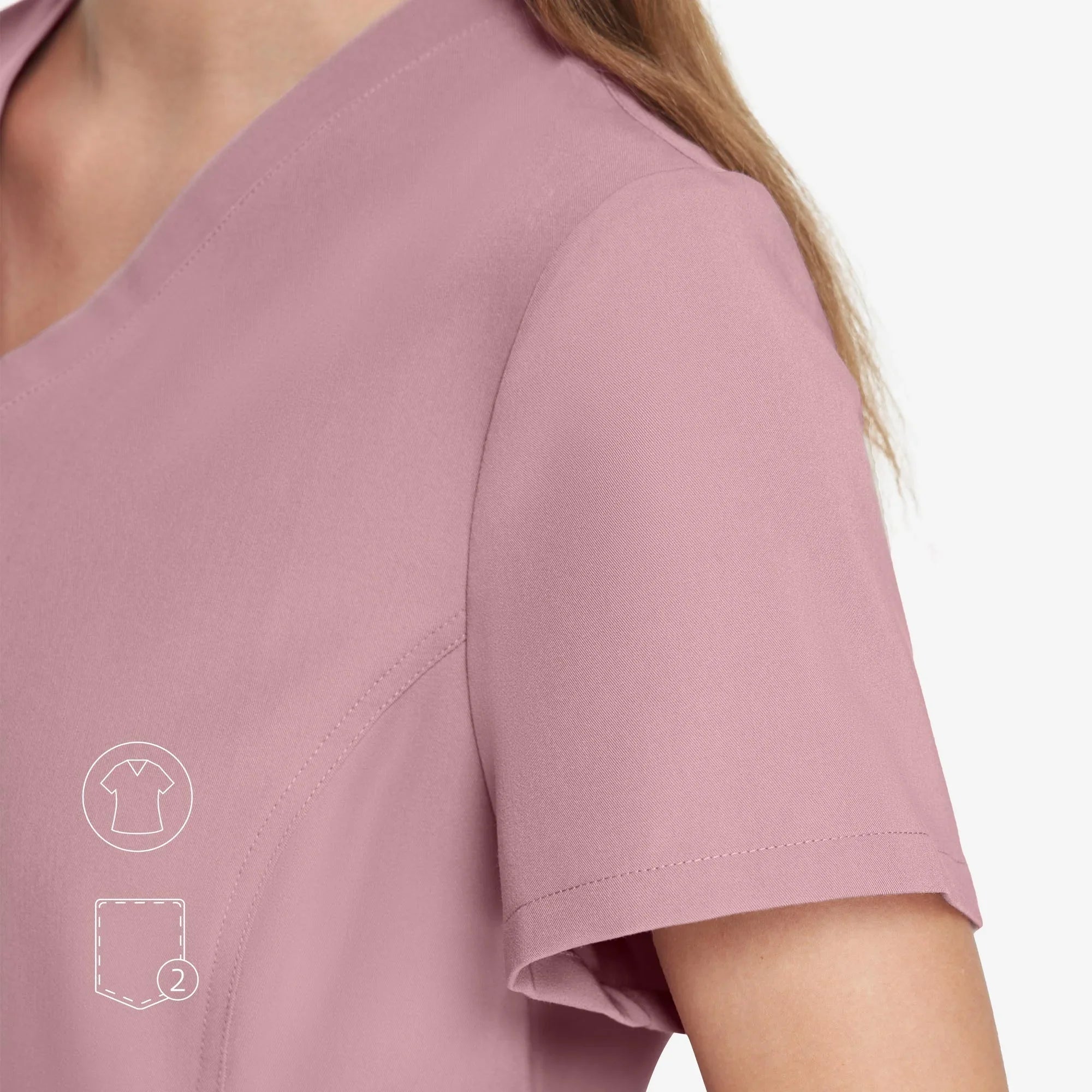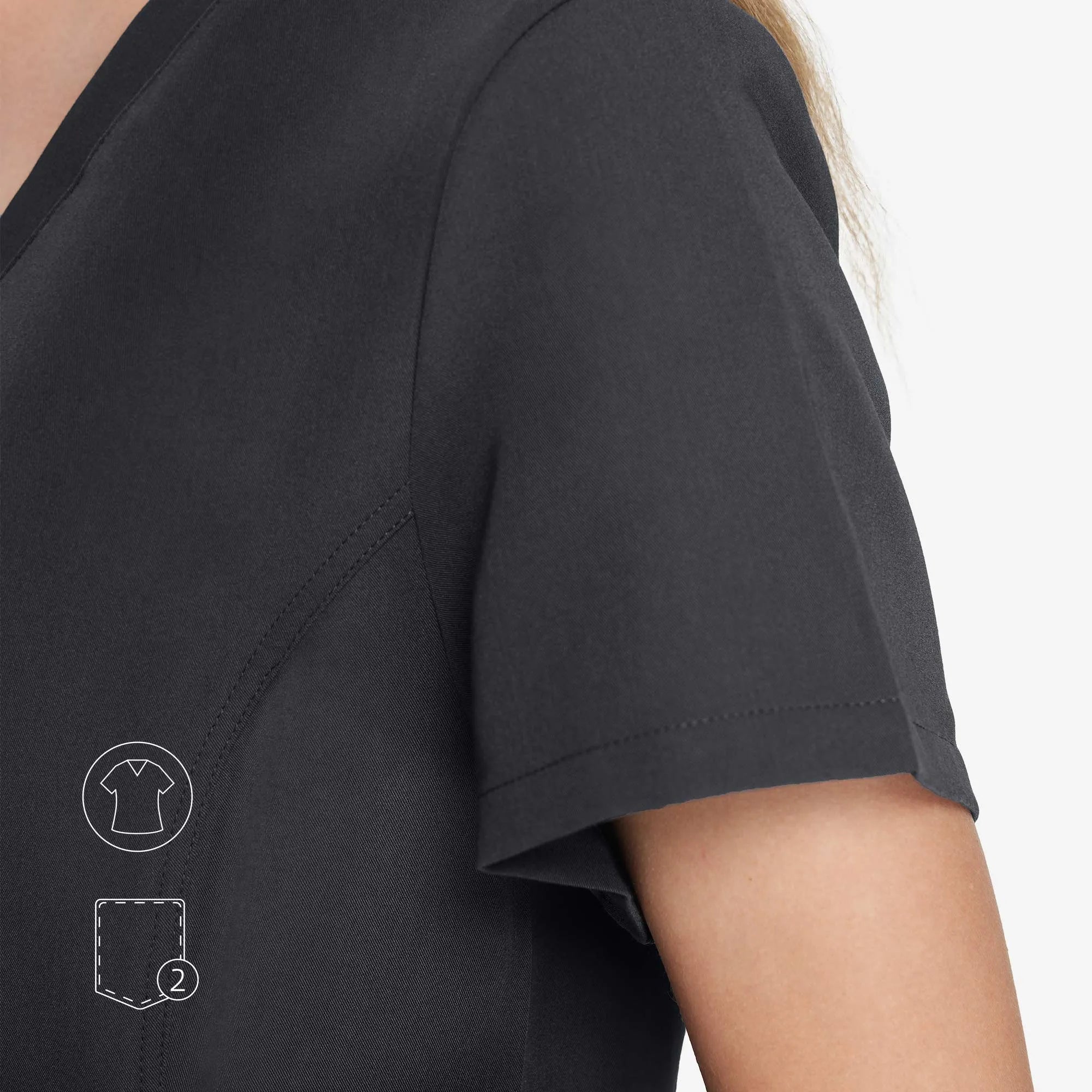 The Dabney™ scrub top combines a modern V-neck, draped drop-shoulder fit, and tulip hem with smart princess seams and practical pocket design.