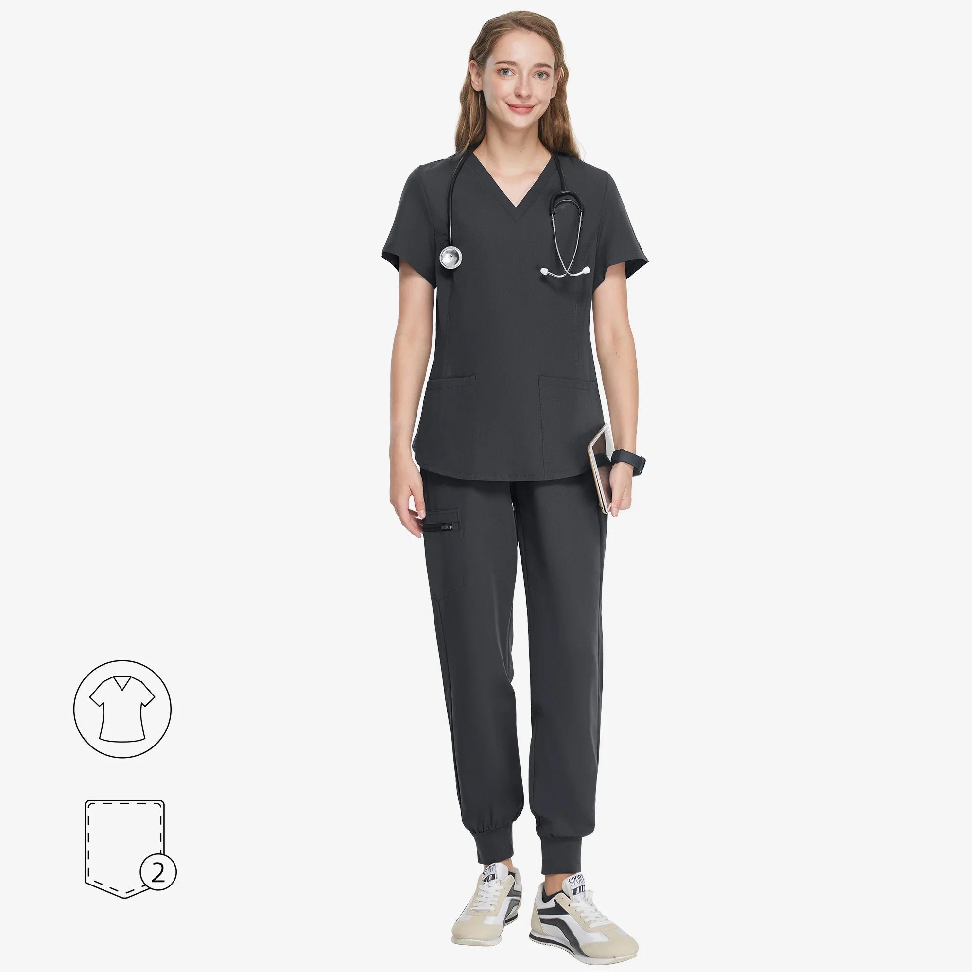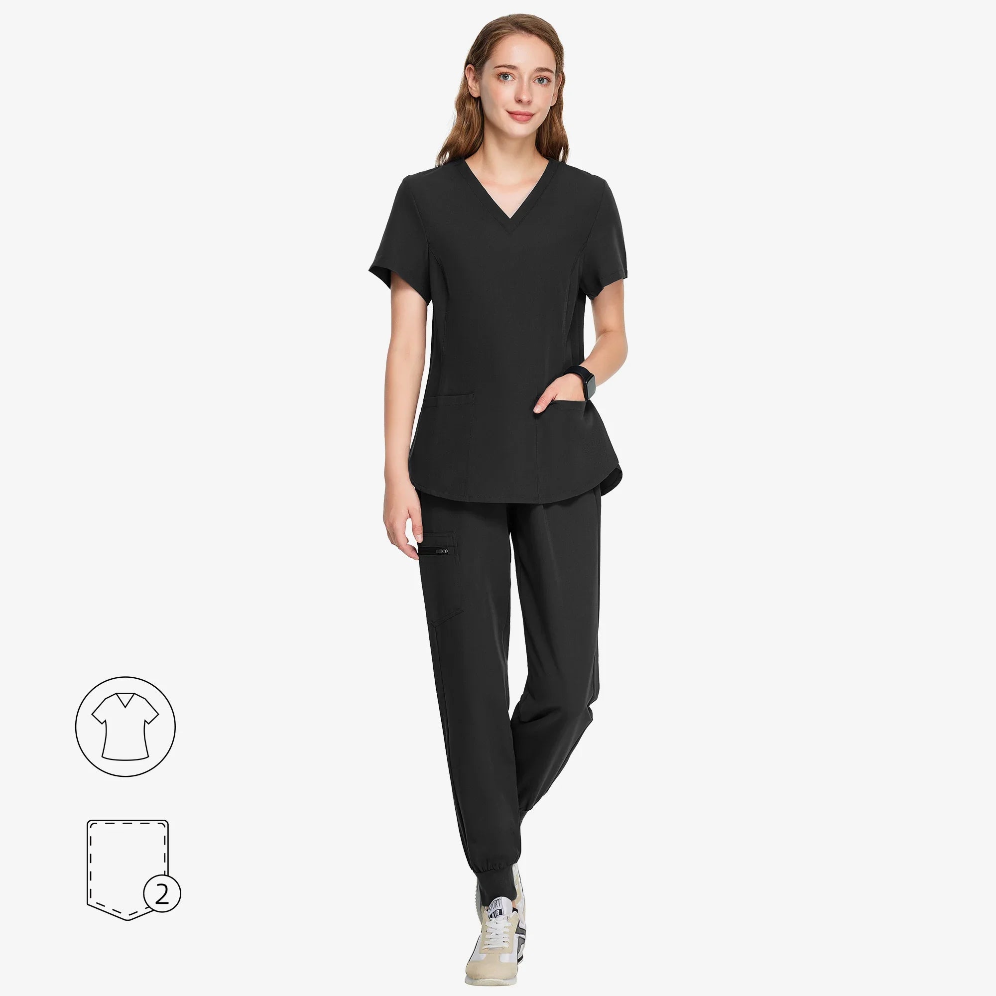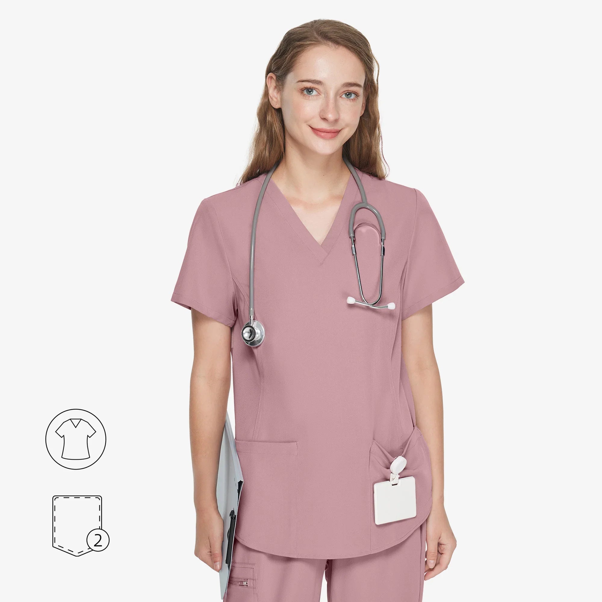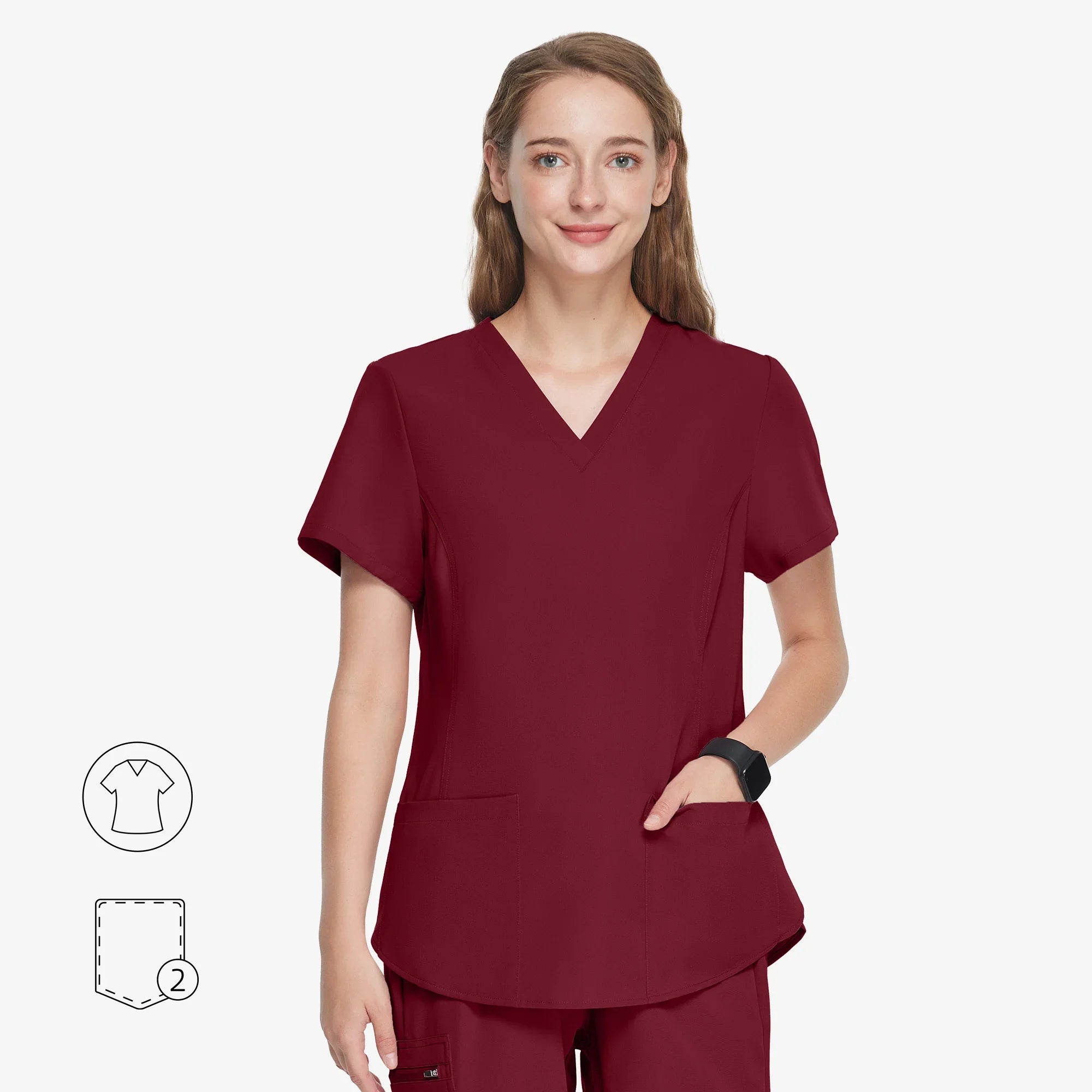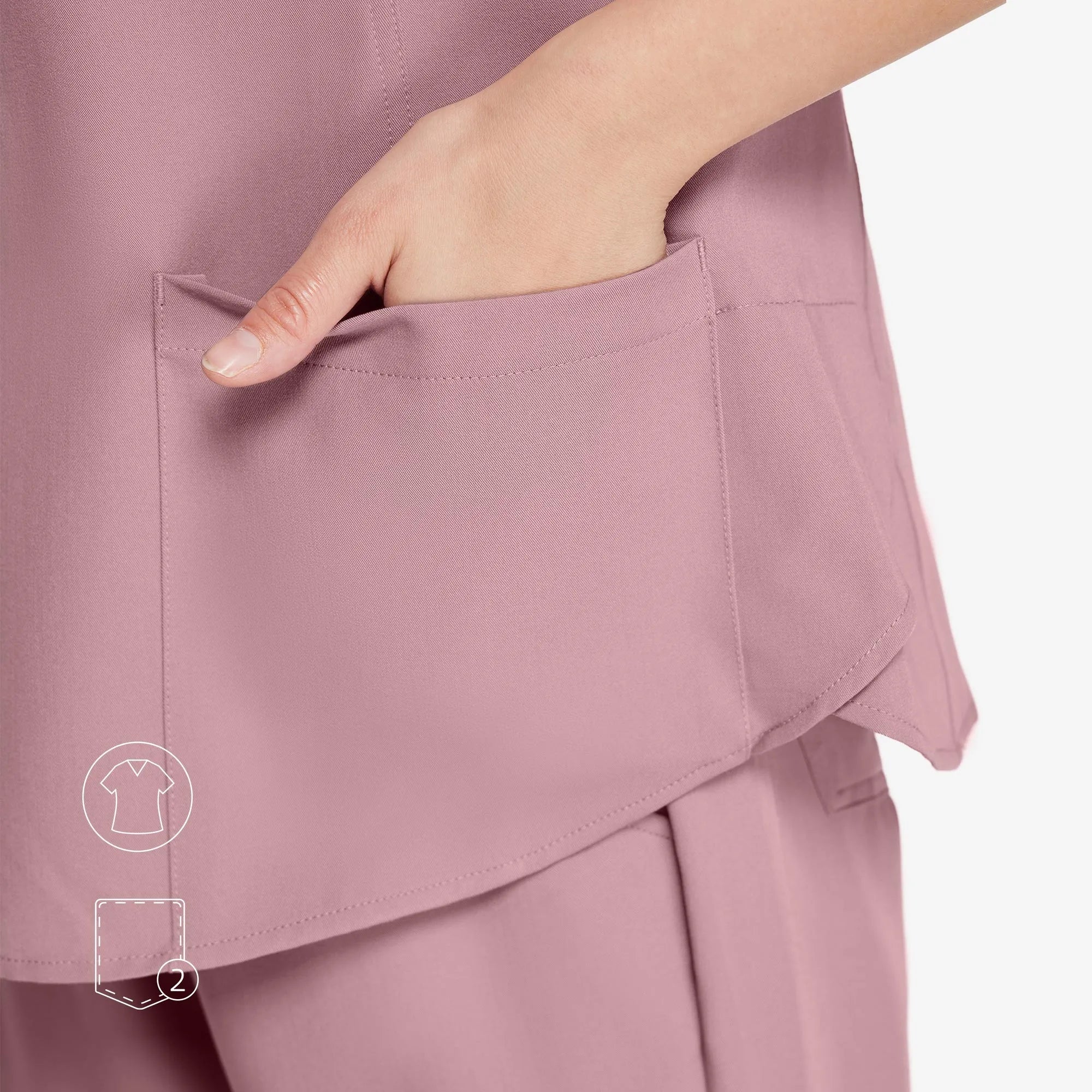 The Dabney™ scrub top combines a modern V-neck, draped drop-shoulder fit, and tulip hem with smart princess seams and practical pocket design.